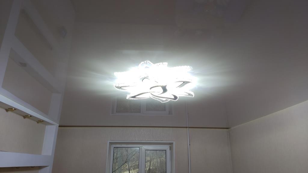 Отражение глянцевого потолка от прекрасной люстры, заполняет всё помещение ярким светом. Скрытая гардина для штор, современное и популярное решение, была смонтирована по просьбе заказчика. Оставляйте заявку на расчёт потолка, мы поможем подобрать оптимальное решение под ваш бюджет.